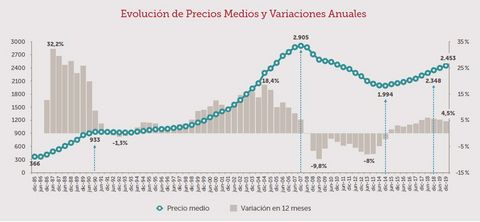 El precio medio de la vivienda nueva en España se sitúa en 2019 en 2.453 €/m2, un 4,5% más que el año anterior, con un crecimiento en el segundo semestre del año del 2,2%. Se modera así el incremento de precios al registrar un 0,9% menos de crecimiento que en 2018