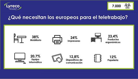 Lyreco ha preguntado a más de 7.000 trabajadores qué materiales o equipo mejorarían su nivel de confort y les ayudaría a ser más eficientes. Las respuestas más frecuentes han sido: mobiliario de oficina (38%) como sillas, escritorios y lámparas, impresoras (24%) y artículos ergonómicos (23,4%) como reposapiés y cojines lumbares, ratones ergonómicos o soportes para ordenador.