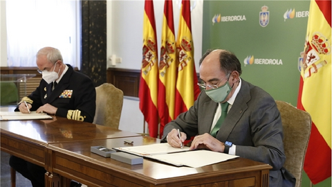 El presidente de Iberdrola, Ignacio Galán, y el Jefe del Estado Mayor de la Defensa (JEMAD), almirante general Teodoro E. López Calderón, en representación del Ministerio de Defensa, han firmado hoy un acuerdo de colaboración con el objetivo de desarrollar programas de investigación y formación en distintos ámbitos de interés para ambas partes.