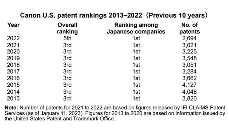 Durante 38 años seguidos, Canon siempre ha estado entre las cinco primeras compañías por número de patentes.