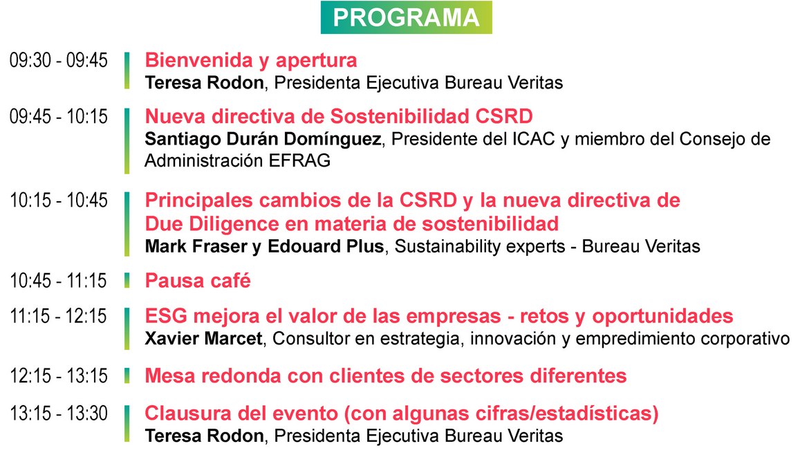 Los expertos compartirán las exigencias de la CSRD y los directivos de las empresas invitadas explicarán como plantean y adaptan su estrategia de sostenibilidad a los nuevos requisitos, para cumplir con los objetivos de desarrollo sostenible de la Agenda 2030 y responder a las demandas del mercado y la sociedad.