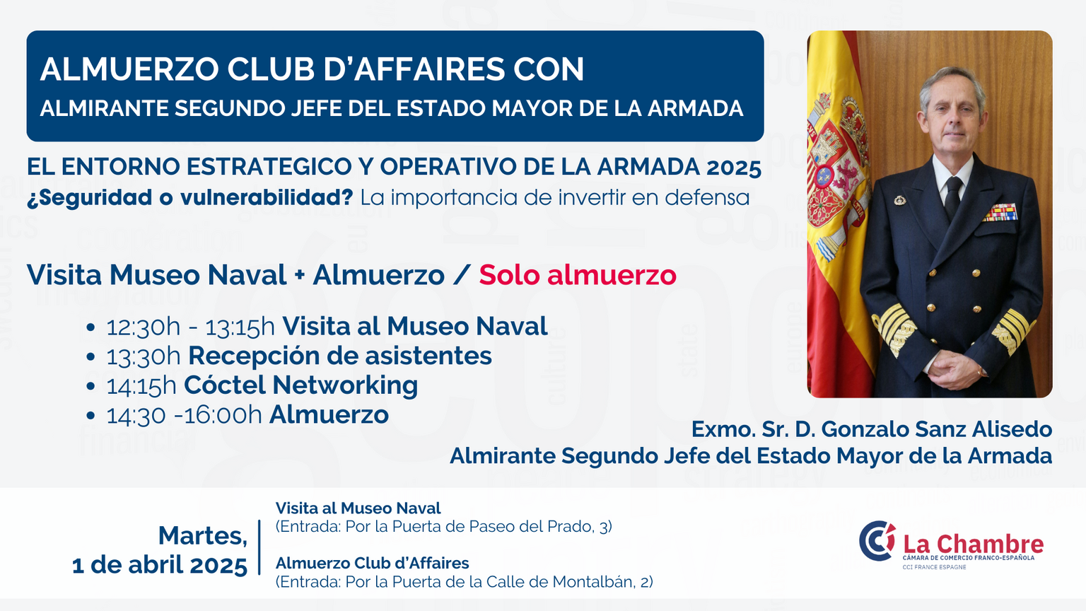 Reserva desde ya tu plaza en la Visita al Museo Naval + Almuerzo o Solo Almuerzo con el Almirante Segundo Jefe del Estado Mayor de la Armada D. Gonzalo Sanz Alisedo el próximo martes 1 de abril.
