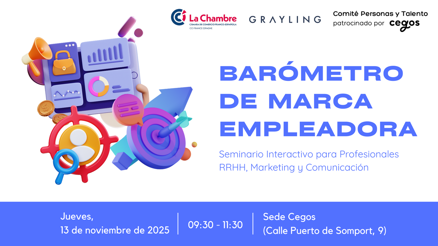Desde el Comité de Personas y Talento, en colaboración con Cegos y Grayling, te invitamos el jueves, 13 de noviembre al Barómetro de Marca Empleadora, que tendrá lugar en la sede de Cegos en horario de 9:30 a 11:30 horas.