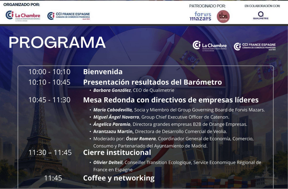 El jueves 26 de marzo presentaremos en el Auditorio Pérez-Llorca la cuarta edición del Barómetro del Clima Empresarial Francés en España, organizado por la Cámara de Comercio Franco-Española de Madrid y la Cámara de Comercio Francesa de Barcelona en colaboración con Qualimetrie.