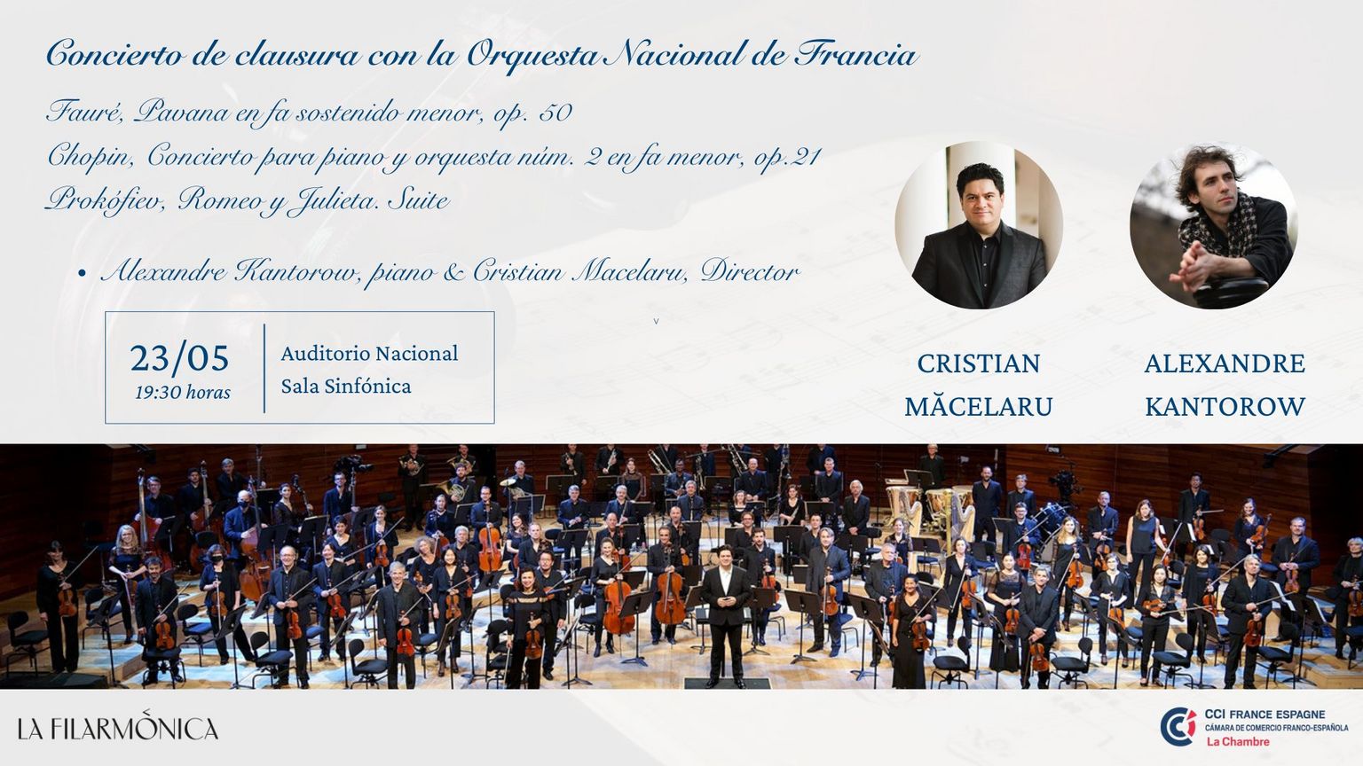Gran Concierto de clausura de la temporada de conciertos La Filarmónica, presentado por GrupCamera en colaboración con la Orquesta Sinfónica Nacional de Francia (ONF) y su director titular Cristian Măcelaru.