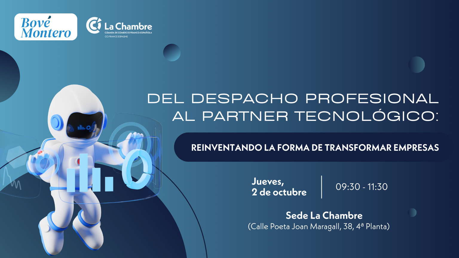 "En este desayuno mostraremos cómo una firma con más de cuatro décadas de trayectoria ha sabido transformarse de forma disruptiva hacia nuevos modelos de negocio. Desde Bové Montero, una firma tradicional de servicios, se ha transformado combinando inteligencia artificial, automatización y explotación de datos para acompañar a empresas de cualquier sector en su camino hacia la eficiencia y la innovación.