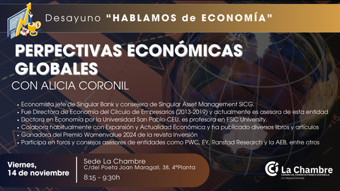 Continuamos con los desayunos de La Chambre "Hablamos de economía" con Alicia Coronil. Esta sexta sesión tendrá lugar el viernes 14 de noviembre.