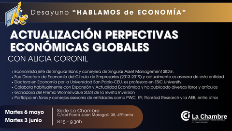 El próximo martes 3 de junio, nuestros socios del Club D´Affaires, están invitados a la 4ª sesión de los desayunos de La Chambre "Hablamos de economía" con Alicia Coronil Jónsson, de 8:15 a 9:30h en la Sede de La Cámara (C/ Poeta Joan Maragall, 38, 4ª planta).