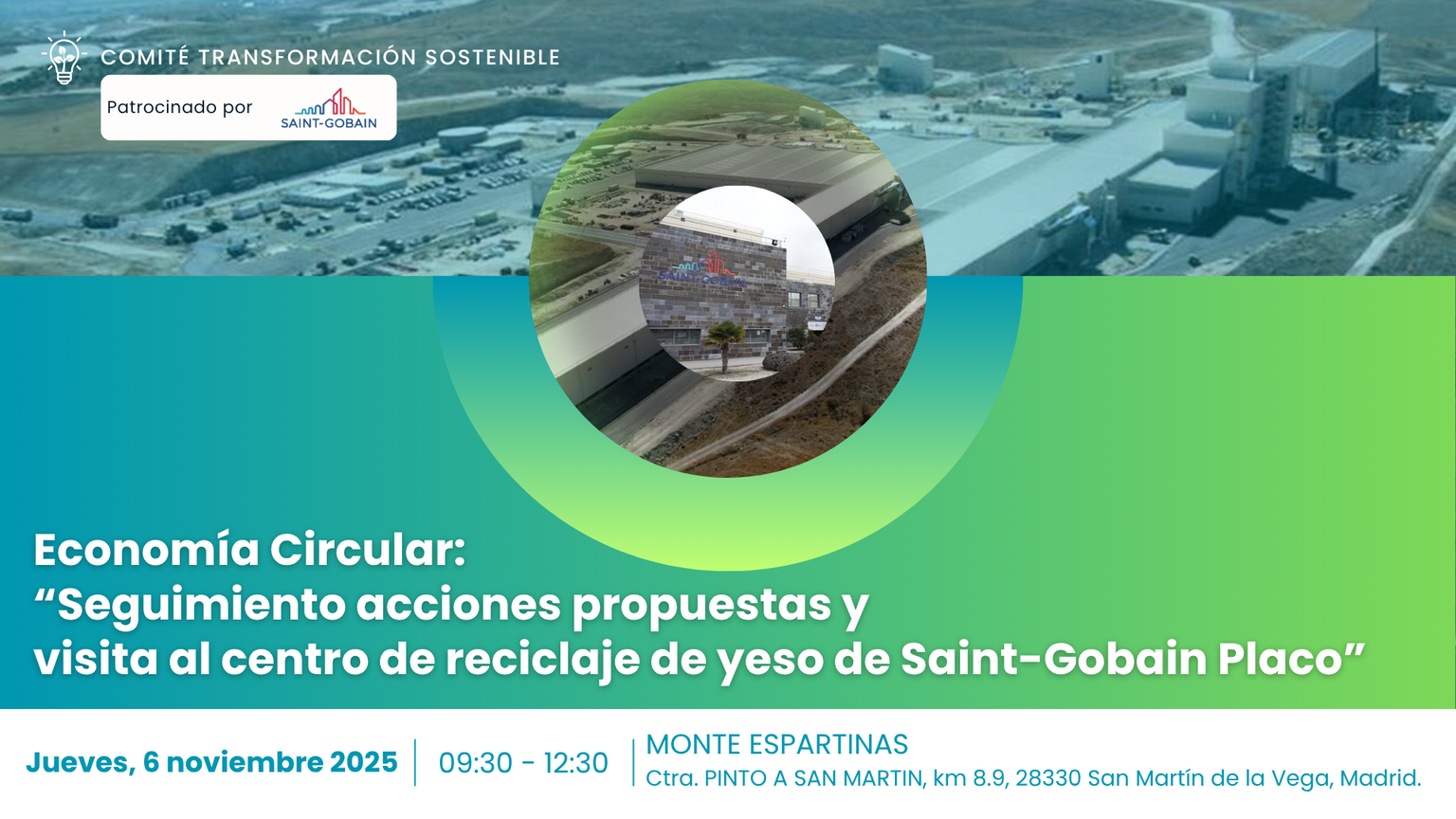 Nuestro Comité de Transformación Sostenible, patrocinado por Saint-Gobain, te invita al evento "Economía Circular: seguimiento acciones propuestas y visita al centro de reciclaje de yeso de SG PLACO" que tendrá lugar el jueves, 6 de noviembre de 09:30 a 12:30 en Monte Espartinas de San Martín de la Vega.