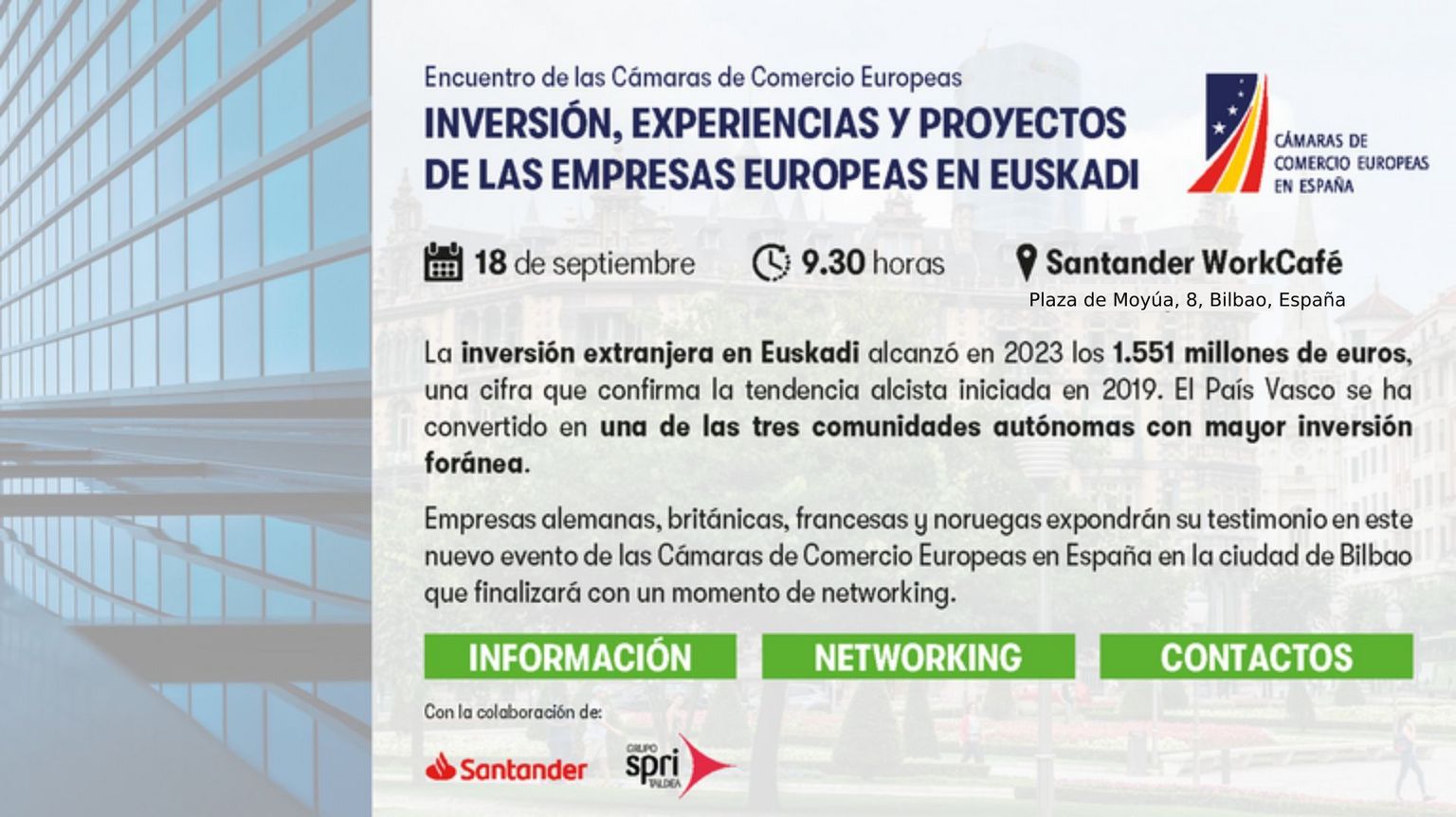 La inversión extranjera en Euskadi alcanzó los 1.551 millones de euros en 2023. Este crecimiento posiciona al País Vasco como uno de los destinos más atractivos para la inversión en España. En este contexto de éxito económico, tenemos el placer de invitarles a un evento único, organizado por las Cámaras de Comercio Europeas en Bilbao, que se celebrará el próximo 18 de septiembre a las 09:30 horas.