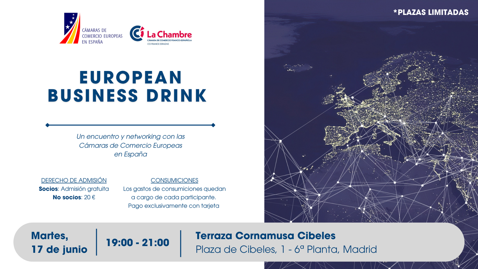 Tenemos el placer de invitaros al próximo EUROPEAN BUSINESS DRINK en Madrid del año 2025 conjuntamente con las demás Cámaras de Comercio Europeas en España.