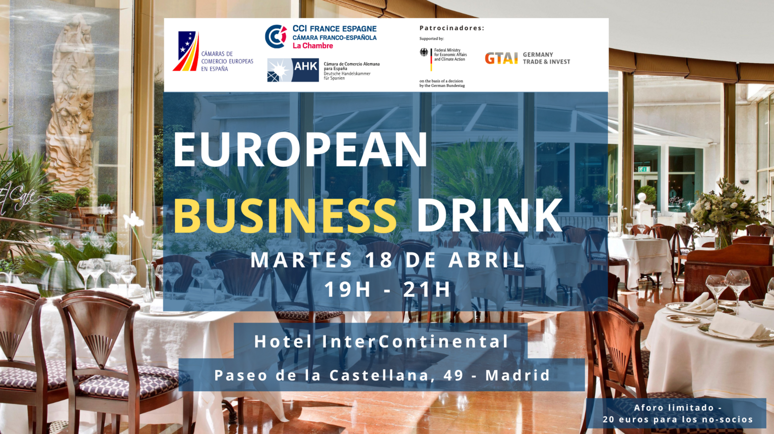 Tenemos el placer de invitaros a un nuevo EUROPEAN BUSINESS DRINK que celebramos el próximo día 18 de abril a las 19:00h en el Hotel InterContinental Madrid, conjuntamente con las demás Cámaras de Comercio Europeas en España.