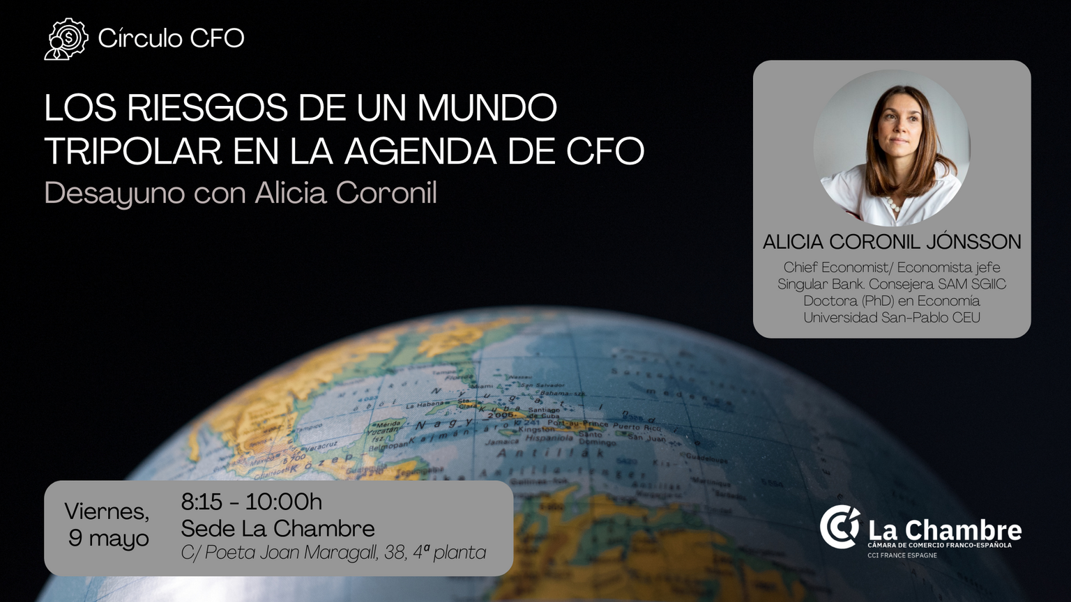 El próximo viernes 9 de mayo tendrá lugar "Los riesgos de un mundo tripolar en la agenda de CFO", el Desayuno del Círculo de CFO con Alicia Coronil, de 8:30 a 10:00h en la Sede de la Cámara.