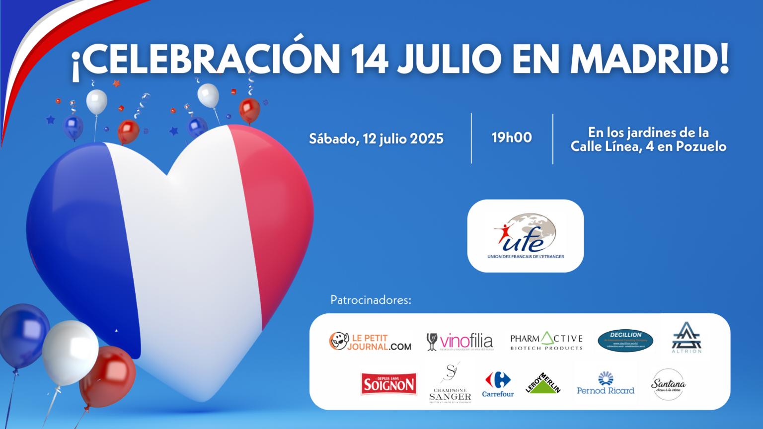 La UFE y sus patrocinadores se unen para invitaros a una velada excepcional con motivo de la Fiesta Nacional del 14 de julio, que se celebrará el sábado 12 de julio, de 19:00 a 24:00 h, en los magníficos Jardines de la Calle Línea, nº 4, en Pozuelo.