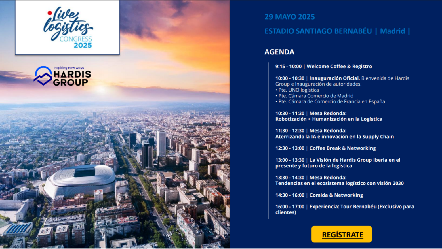 Hardis Group, te invita al Live Logistics Congress 2025, el evento de referencia para el ecosistema logístico en Iberia. Un encuentro exclusivo donde se explorarán las tendencias clave, la tecnología y la innovación que están transformando el sector, además de generar oportunidades de networking. Contarán con la presencia de más de 120 profesionales del ámbito logístico.