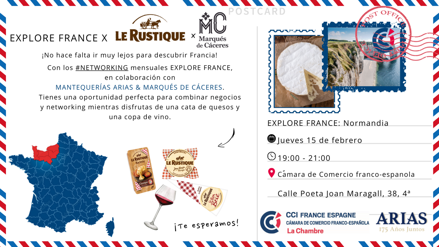 Con los networking mensuales EXPLORE FRANCE, en colaboración con MANTEQUERIAS ARIAS, tienes una oportunidad perfecta para combinar negocios y networking mientras disfrutas de una cata de quesos típicos como el Camembert Le Rustique, el Brie y la Raclette ?