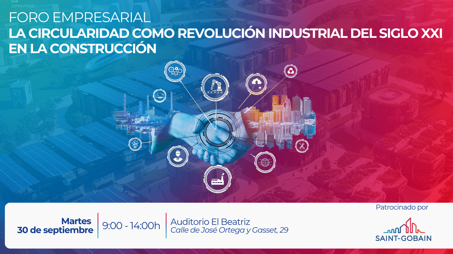 Te invitamos al Foro “La Circularidad como Revolución Industrial del Siglo XXI en la construcción” el martes, 30 de septiembre, un espacio único de intercambio y reflexión organizado junto a nuestro socio Saint-Gobain y para el que contaremos con la colaboración de empresas líderes del sector de la construcción, ingeniería y sostenibilidad.