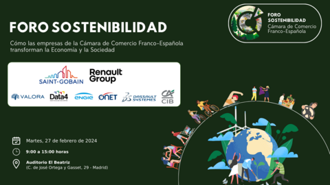 La Cámara de Comercio Franco-Española organiza la I Edición del Foro de Sostenibilidad, el próximo martes 27 de febrero de 9:00 a 15:00 horas en el Auditorio El Beatriz (Ortega y Gasset, 29); un evento innovador que reunirá a líderes y empresas comprometidos con la transformación sostenible.