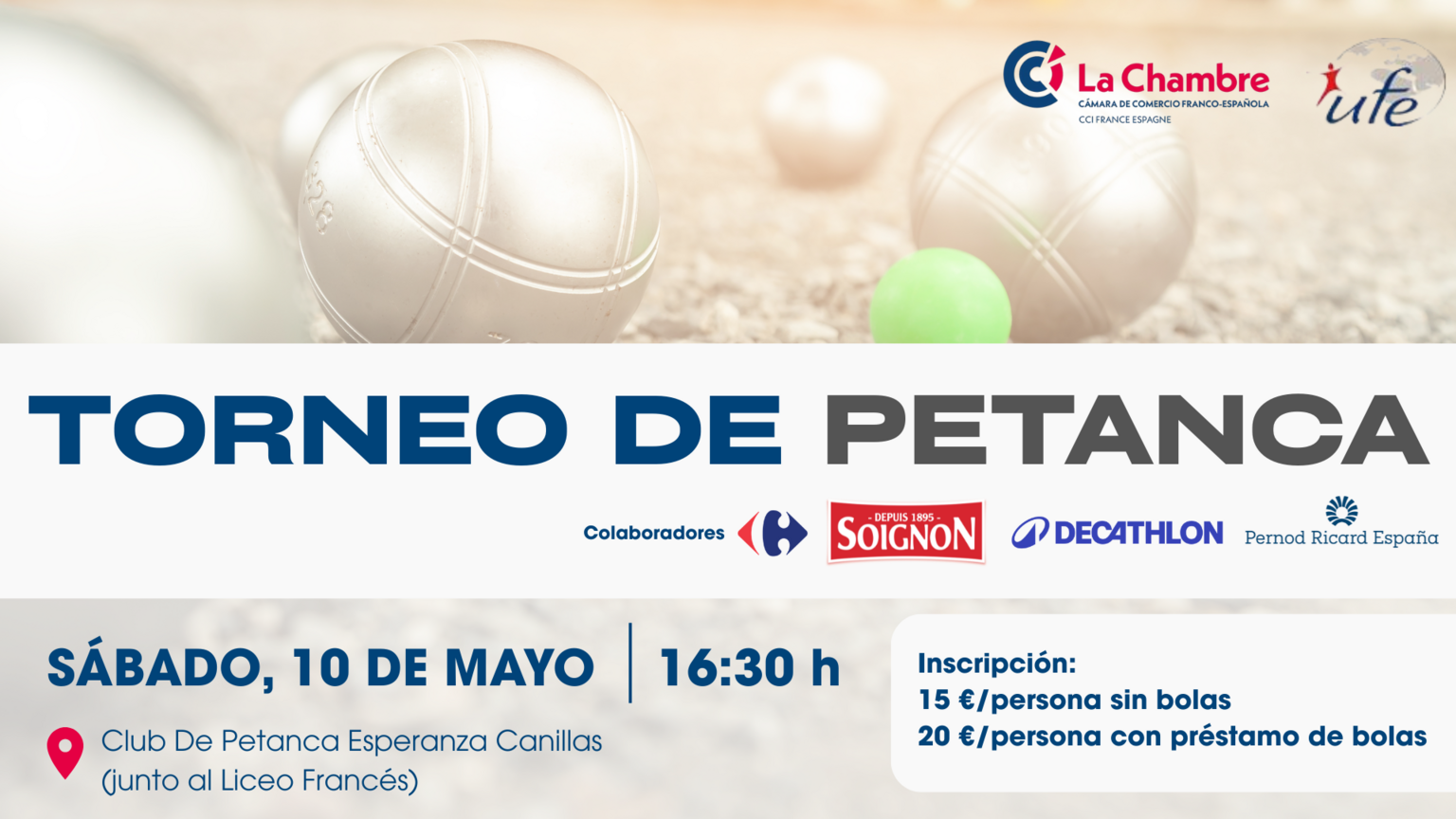 El próximo sábado 10 de mayo La Chambre celebra su tercer torneo de petanca en el Club de Pentanca Esperanza Canillas (junto al Liceo Francés)