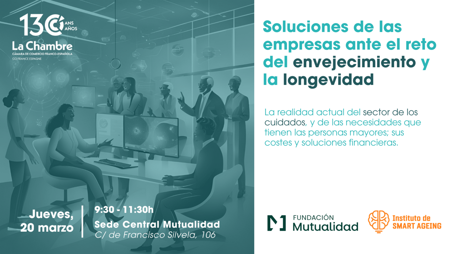 El próximo jueves 20 de marzo tendrá lugar el evento: "Soluciones de las empresas ante el reto del envejecimiento y la longevidad". Se celebrará en la Sede Central Mutualidad y está organizado por la Cámara de Comercio Franco-Española con el apoyo del Instituto de Smart Ageing.