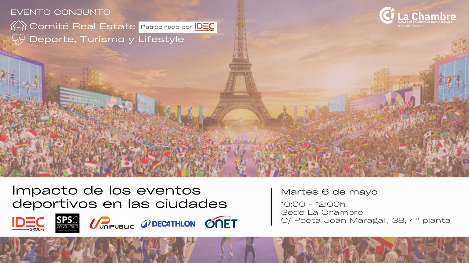 El próximo martes 6 de mayo no te pierdas "Impacto de los eventos deportivos en las ciudades", nuestro evento del Comité de Real Estate, patrocinado por IDEC, y del Comité Deporte, Turismo y Lifestyle que tendrá lugar en la Sede de la Chambre, de 10:00 a 12:00h.