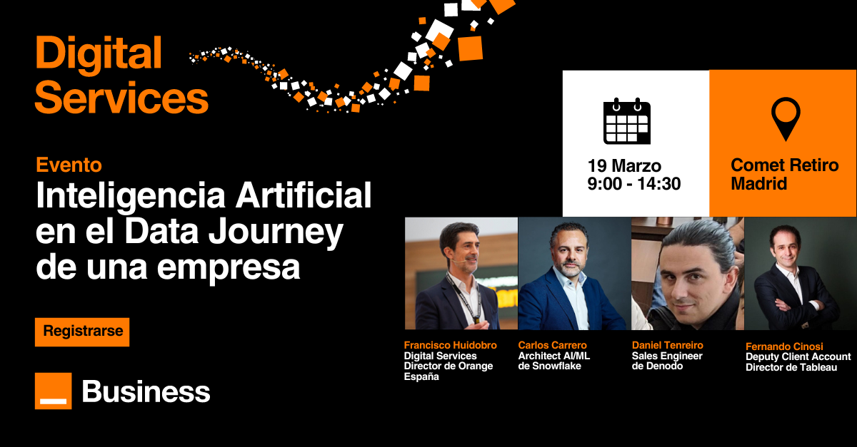 De la mano de Orange Business, diversos expertos compartirán con los asistentes cómo la Inteligencia Artificial ya se integra en diversas etapas del "Data Journey" empresarial.