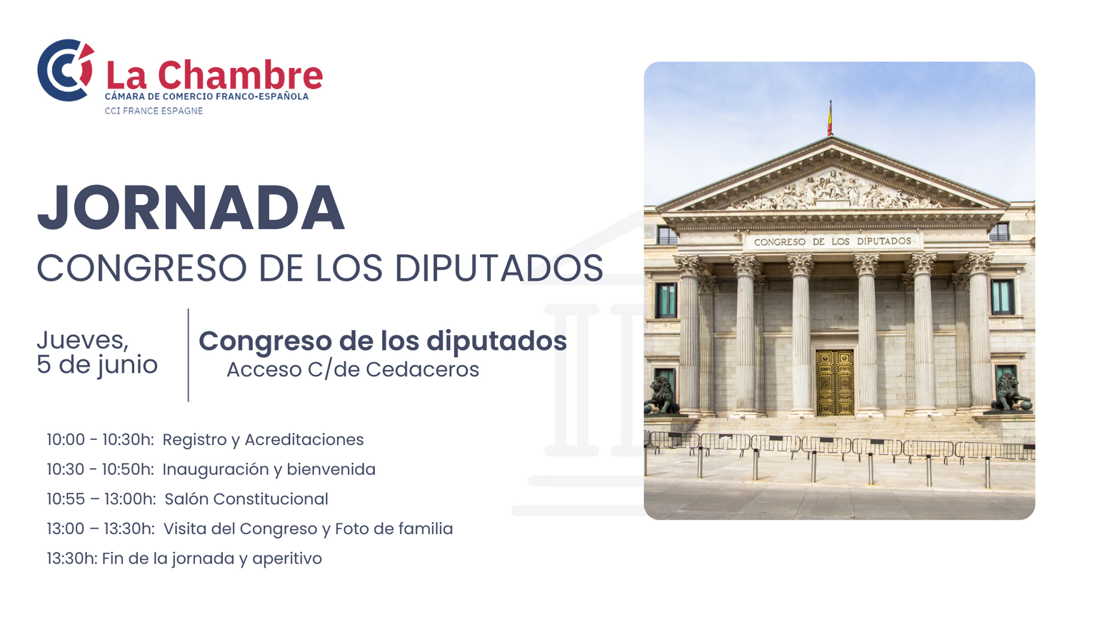 Desde la Cámara de Comercio Franco-Española nos complace comunicaros que estamos organizando un importante evento en el Congreso de los Diputados el próximo jueves 5 de junio, con el objetivo de que podáis conectar con las instituciones y fomentar con ellas un diálogo continuo.