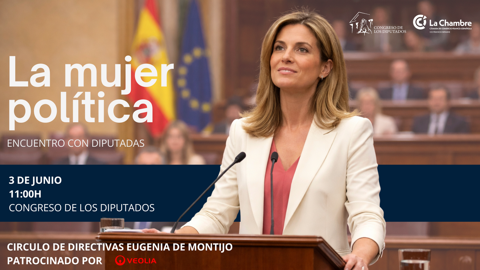 Desde el Círculo de Directivas Eugenia de Montijo queremos invitarte al evento La Mujer Política, que tendrá lugar el miércoles 3 de junio a las 11:00h en el Congreso de los Diputados.