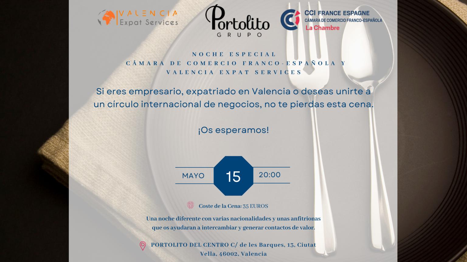 Si eres empresario, expatriado en Valencia o desea unirte a un Círculo Internacional de Business no te pierdas esta cena el 15 de mayo en Valencia.