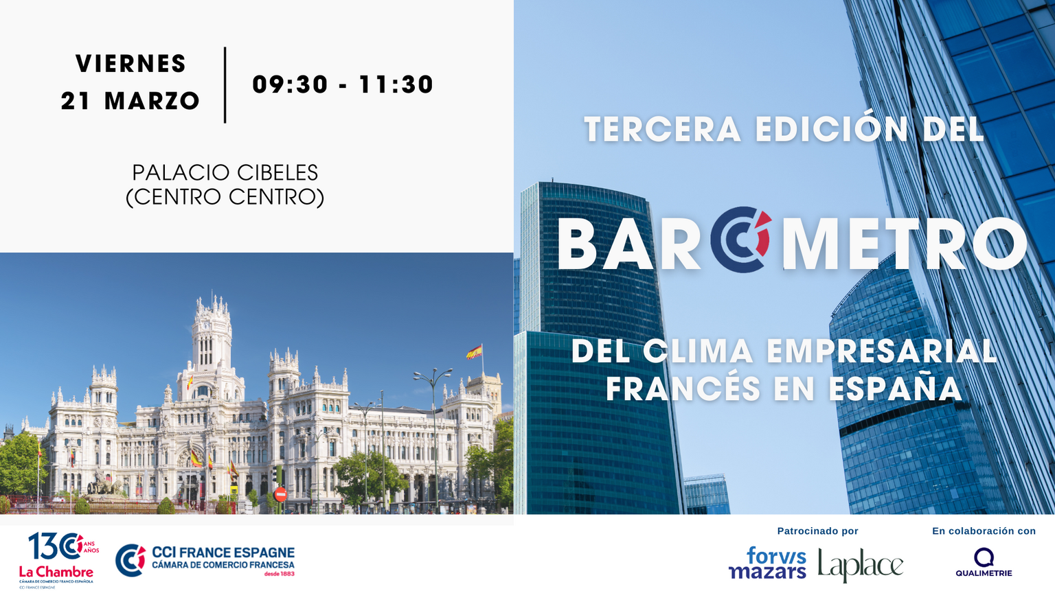 El viernes 21 de marzo presentaremos en el Ayuntamiento de Madrid (Palacio de Cibeles) la tercera edición del Barómetro del Clima Empresarial Francés en España, organizado por la Cámara de Comercio Franco-Española de Madrid y la Cámara de Comercio Francesa de Barcelona.