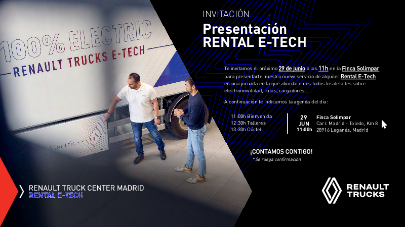 Renault-Trucks te invita al lanzamiento de su oferta de alquiler de eléctricos en nuestro centro Renault Trucks de Madrid el 29 de junio.