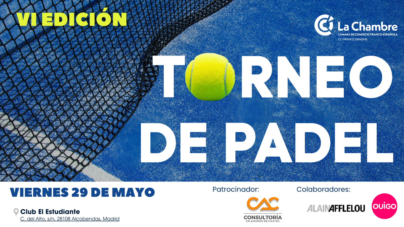 La Cámara de Comercio Franco-Española (La Chambre) tiene el placer de invitaros a la VI edición de su Torneo de Pádel, que se celebrará el 29 de mayo en el Club de Pádel El Estudiante.