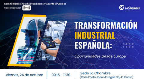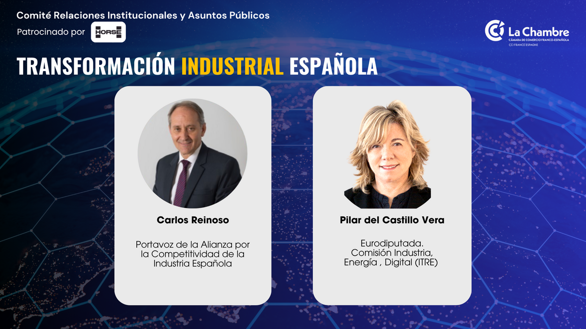 Desde el Comité de Relaciones Institucionales y AAPP de la Cámara Franco-Española, tenemos el placer de invitarles a participar en un nuevo foro de debate sobre la Transformación Industrial Española: Oportunidades desde Europa, que contará con la participación de Pilar del Castillo, Eurodiputada y miembro de la Comisión de Industria, Energía y Digital (ITRE) y Carlos Reinoso, Portavoz de la Alianza por la Competitividad de la Industria Española.