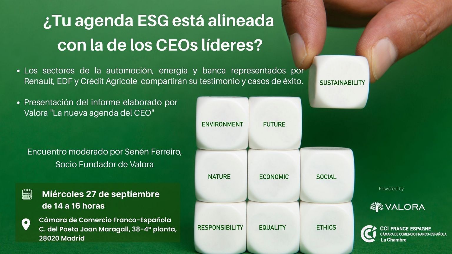 La Cámara de Comercio Franco-Española, en colaboración con Valora te invita a una presentación y cocktail el próximo 27 de septiembre, a las 14 horas, donde compartiremos los resultados del informe "Nueva Agenda del CEO".