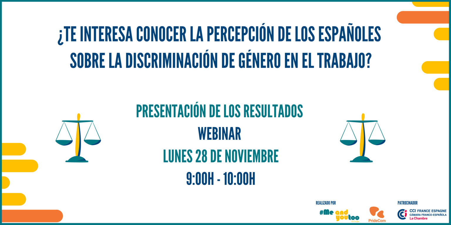 La Comisión Personas y Talento de la Cámara Franco-Española te invita a la presentación del estudio realizado por la consultora francesa MEANDYOUTOO especializada en diversidad e inclusión, en el que ha colaborado la consultora española PRIDECOM, para conocer la percepción de profesionales de empresas españolas sobre igualdad, discriminación y detección del acoso en el trabajo