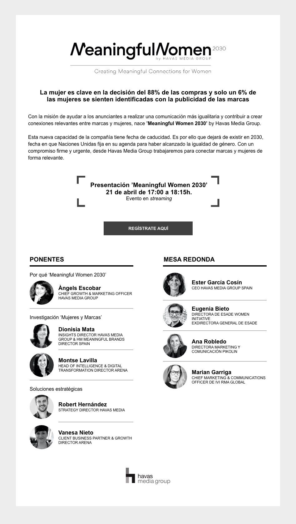 Con la misión de ayudar a los anunciantes a realizar una comunicación más igualitaria y contribuir a crear conexiones relevantes entre Marcas, Mujeres, nace ’Meaningful Women 2030’ by Havas Media Group. Esta nueva capacidad de la compañía tiene fecha de caducidad. Es por ello que dejará de existir en 2030 fecha que Naciones Unidas fija en su Agenda para haber alcanzado la igualdad de género. Con un compromiso firme y urgente, desde Havas Media Group trabajaremos para conectar marcas y mujeres de forma relevante.