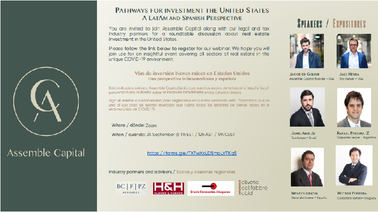 Está invitado a unirse a Assemble Capital junto con nuestros socios de la industria legal y fiscal para una mesa redonda sobre la inversión inmobiliaria en los Estados Unidos.