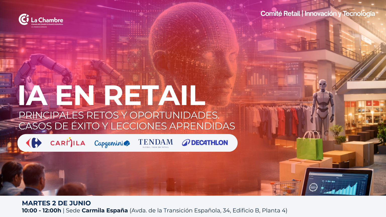Contaremos con la visión de compañías líderes como Carrefour y Tendam, y cerramos el encuentro con vuestras preguntas y comentarios, seguidos de un cóctel de networking, ideal para seguir la conversación, contrastar experiencias y conectar de verdad.