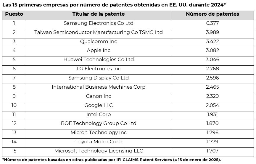Madrid, España, 23 de enero de 2025 - Canon ha ocupado el noveno puesto en número de patentes registradas en la Oficina de Patentes y Marcas de Estados Unidos (USPTO) en 2024, situándose así entre las 10 primeras compañías del mundo durante 41 años consecutivos, según IFI CLAIMS Patent Services, empresa de investigación de patentes con sede en Estados Unidos. Además, Canon ocupa el primer puesto entre las empresas japonesas por vigésimo año consecutivo.