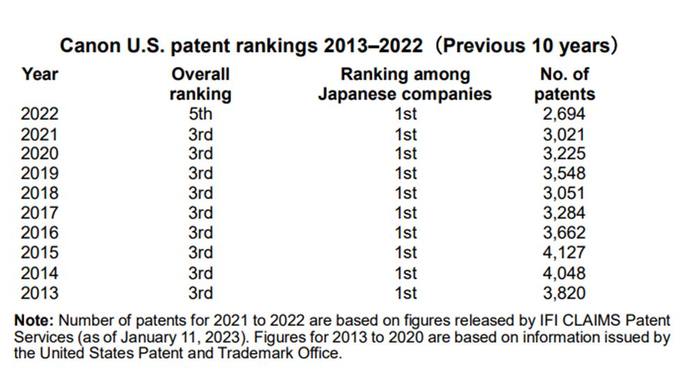 Durante 38 años seguidos, Canon siempre ha estado entre las cinco primeras compañías por número de patentes.