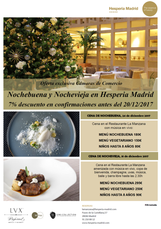 Oferta exclusiva pensada para las Cámaras de Comercio en la que se podrá disfrutar de un 7% de descuento en las cenas de Nochebuena y Nocheviejasi se reserva antes del día 20 de diciembre de 2017.