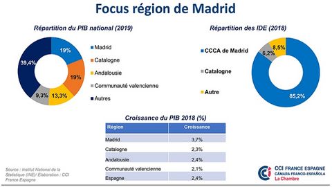 Avec 6,6 millions d’habitants, Madrid est la troisième aire urbaine la plus peuplée de l’Union Européenne. En 2018, elle connait la croissance économique la plus forte du pays (3,7%) et son PIB est le plus élevé à l’échelle nationale, contribuant de ce fait à 19% du PIB espagnol en 2019. La région se démarque également de part son PIB par habitant qui atteint 34 916 euros. A titre de comparaison, la région de Barcelone comptait un PIB par habitant de 30 426 euros pour la même année.