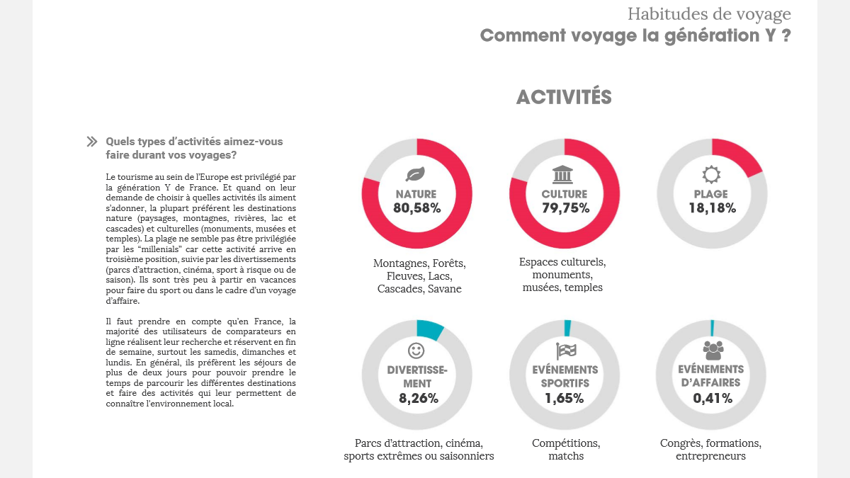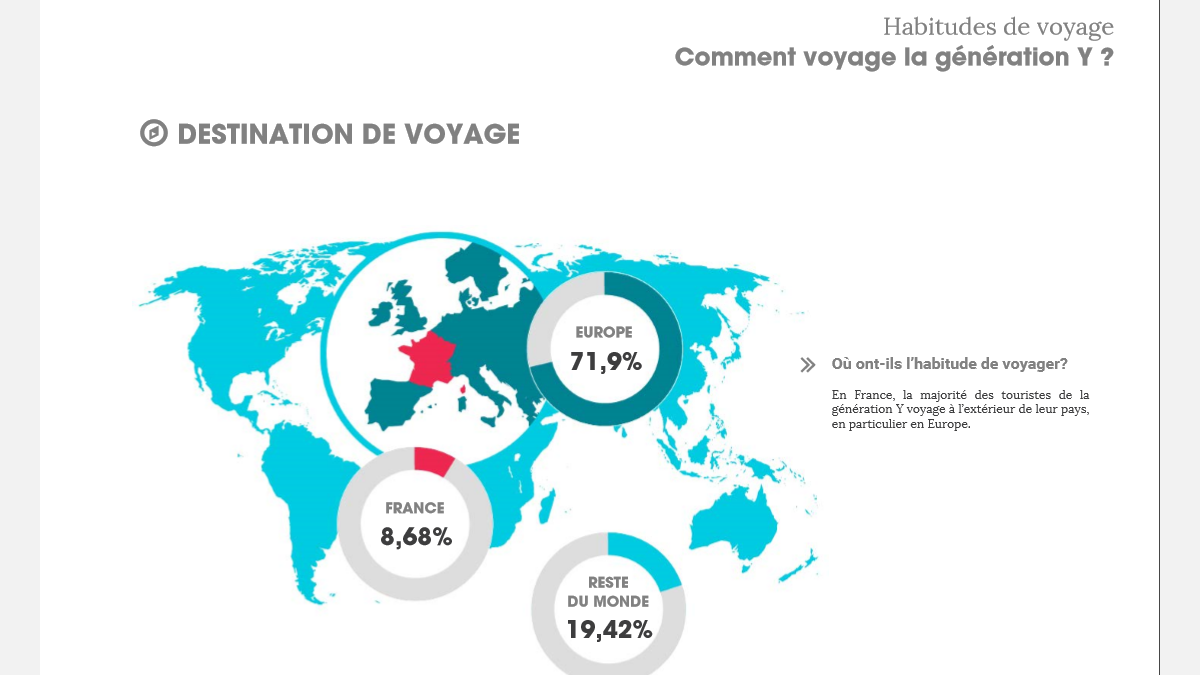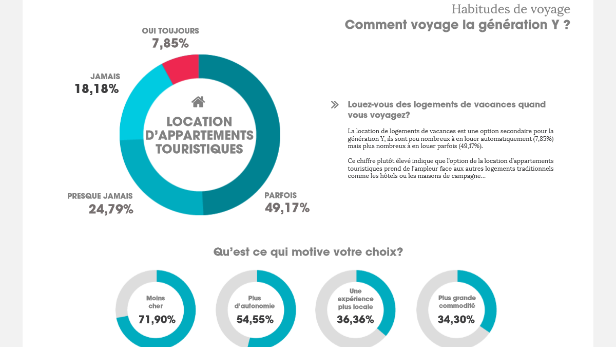 La génération Y marque une nette différence par rapport aux générations antérieures due, en partie, à la révolution technologique dans laquelle ils ont grandi. Ils ont de nouvelles habitudes de voyage et des intérêts très différents. Au moment de choisir un logement pour leurs vacances, les éléments qu'ils prennent en compte sont le prix, la localisation et l'environnement.