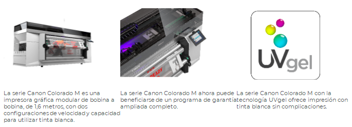 La premiada serie Canon Colorado M consiste en una plataforma individual totalmente modular, que puede ser configurada para cubrir las necesidades específicas de los clientes y ampliarse conforme al negocio, con actualizaciones sencillas en el lugar de la instalación de la impresora. Esta serie escalable incluye dos modelos básicos (M3 y M5), que permiten elegir las velocidades de impresión, con la posibilidad de actualizarlo de un modelo a otro, así como añadir la capacidad de impresión con tinta blanca (M3W y M5W).