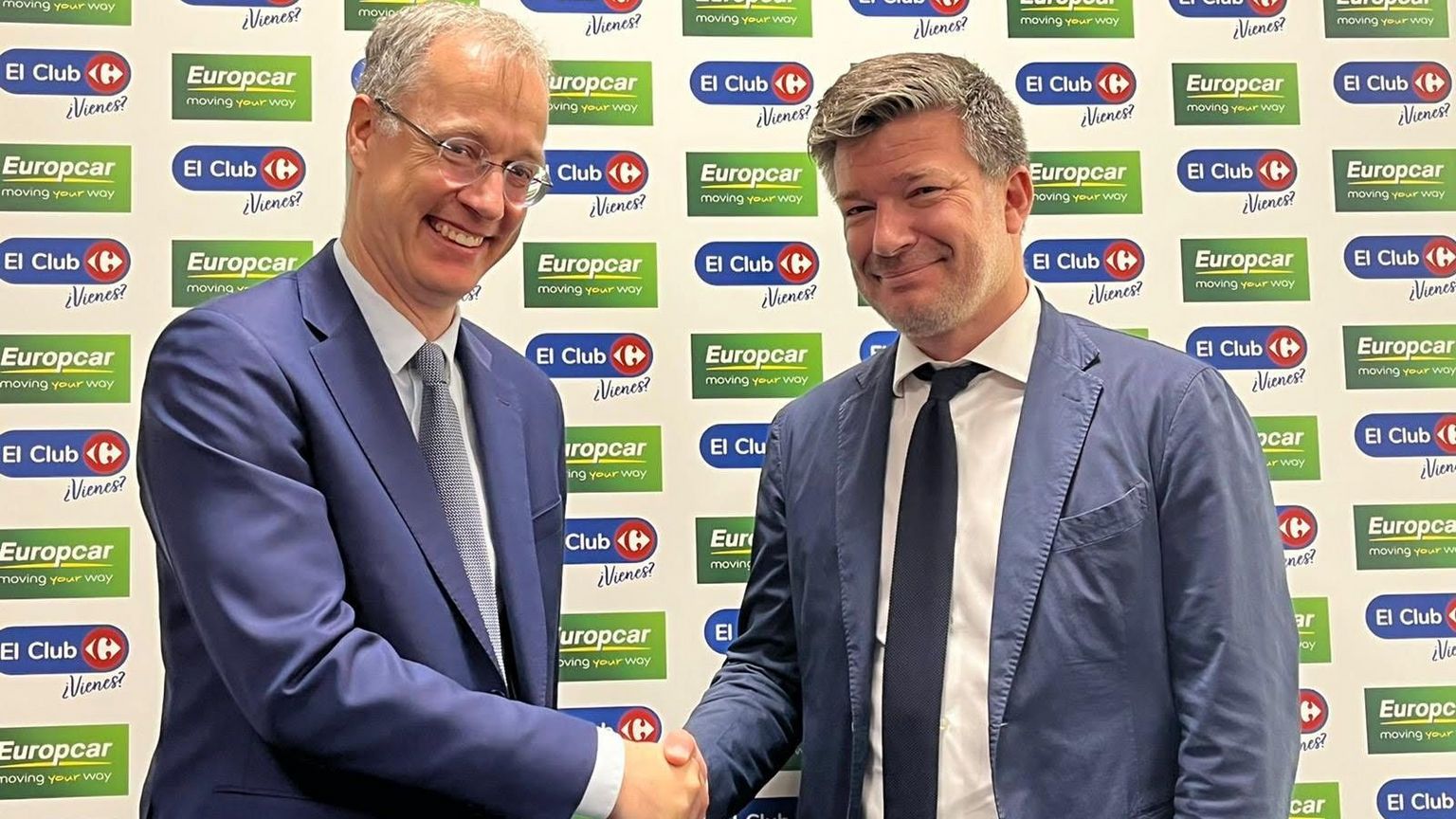 Alexandre de Palmas, director ejecutivo de Carrefour España, y Tobias Zisik, director general de Europcar Mobility Group Iberia, han firmado un acuerdo para que los clientes de la empresa de distribución puedan disfrutar de nuevas ventajas. En virtud de este compromiso, a partir del 6 de julio todos los socios de El Club Carrefour pueden acumular en el Chequeahorro el 10% del alquiler del vehículo que contraten con Europcar. A esta ventaja se irán añadiendo otras ofertas adicionales que se irán desarrollando a lo largo del acuerdo.