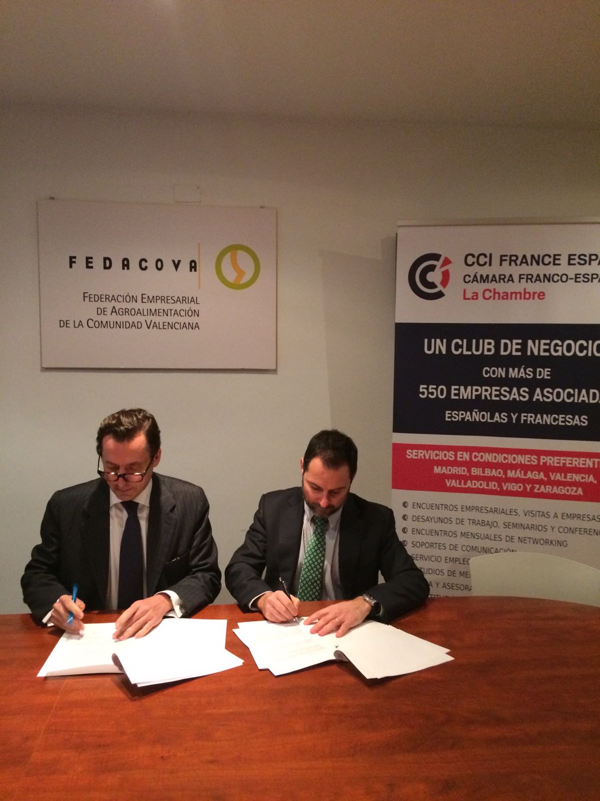 La Federación Empresarial de Agroalimentación de la Comunidad Valenciana -FEDACOVA- y la Cámara Franco-Española de Comercio e Industria -La Chambre- se han comprometido a crear un marco permanente de colaboración institucional, que redunde en el desarrollo de actuaciones dirigidas a los empresarios valencianos en el ámbito geográfico francés y de los empresarios franceses en el ámbito geográfico de la Comunidad Valenciana.
