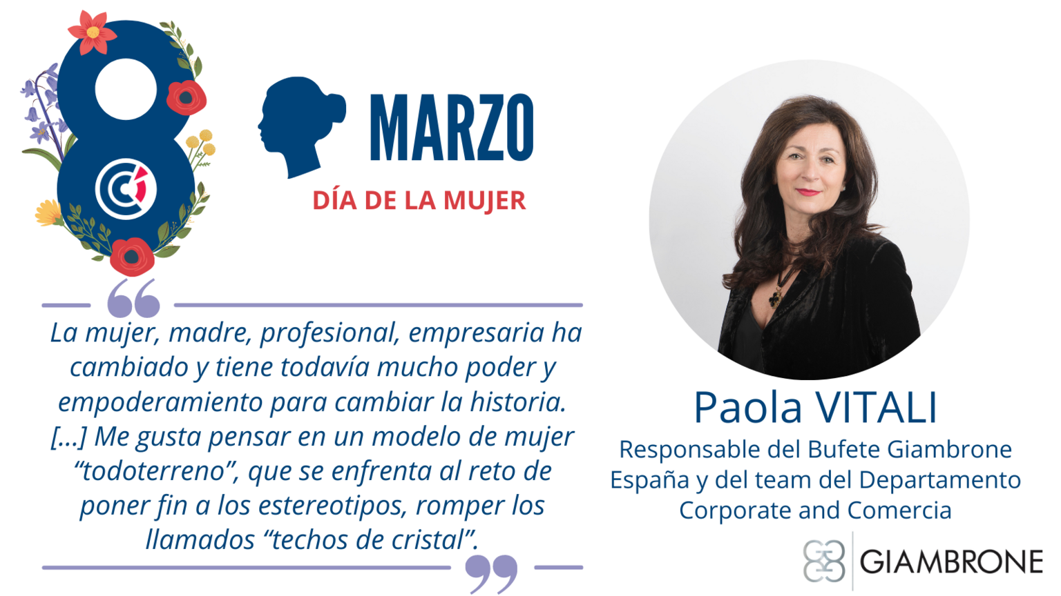Me gusta pensar en un modelo de mujer “todoterreno”, es la mujer que se enfrenta al reto de poner fin a los estereotipos, de romper los llamados “techos de cristal”, que se guía por un sentido de corresponsabilidad, que sabe y quiere compatibilizar su trabajo con las tareas más tradicionales que a la misma se asocian, como el cuidado de la casa o de los hijos, que lucha y avanza para obtener en el mundo laboral y profesional las mismas oportunidades que los hombres. Estos son los principales retos que en lo cotidiano y desde mi pequeña aportación como Responsable del Bufete Giambrone España y del team del Departamento Corporate and Comercial, que por cierto está integrado sólo por mujeres, animó a perseguir y conseguir."