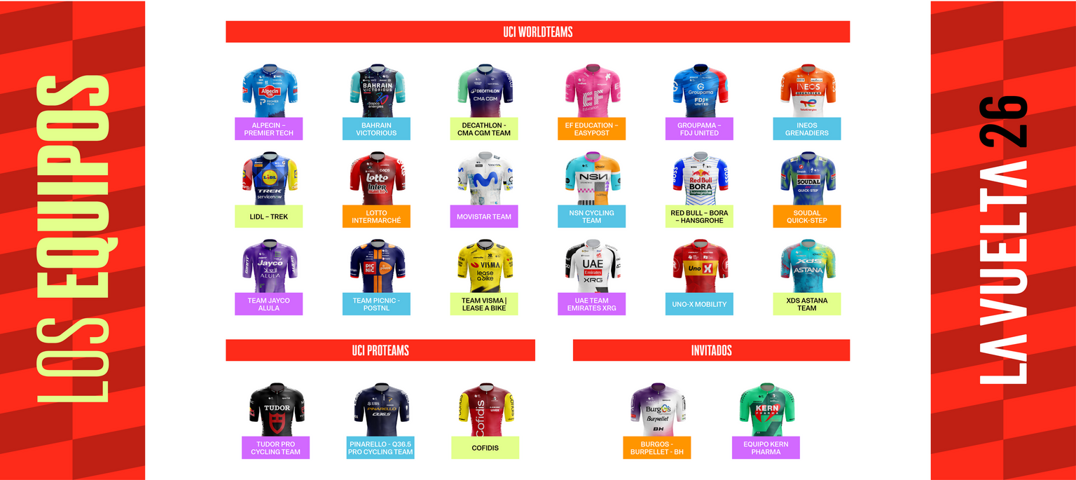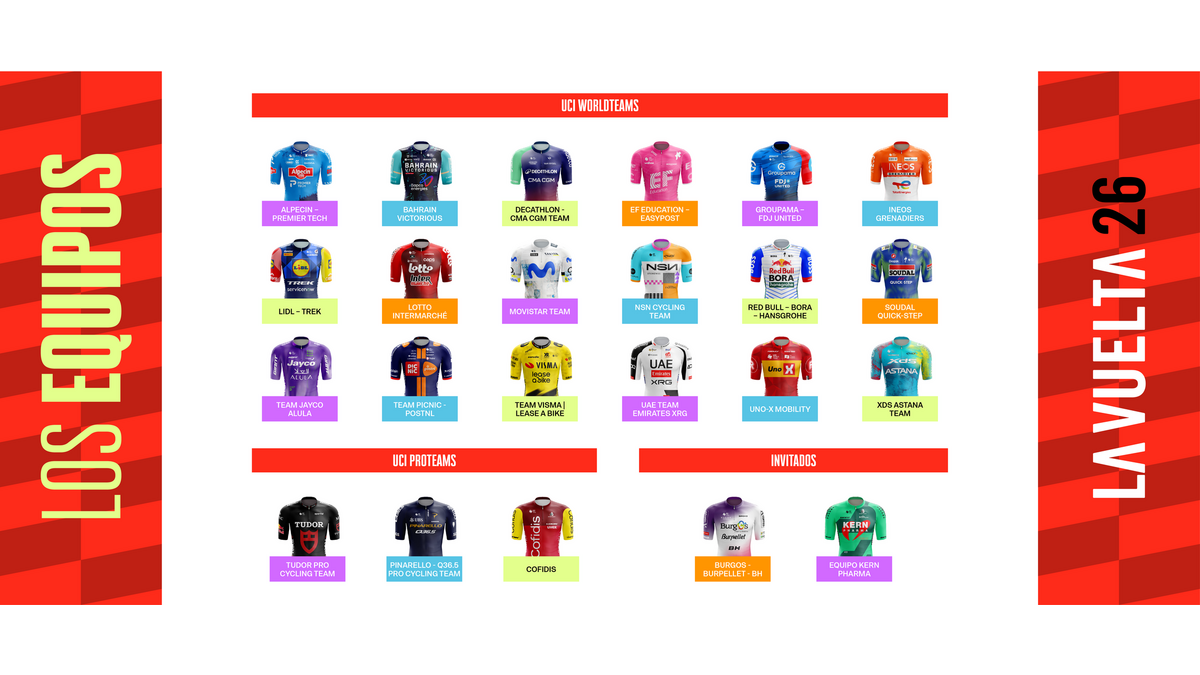Asimismo, los equipos TUDOR PRO CYCLING TEAM (SUI), PINARELLO–Q36.5 PRO CYCLING TEAM (SUI) y COFIDIS (FRA), los tres mejores UCI ProTeams en el ranking UCI de 2025, también participarán en La Vuelta 26.