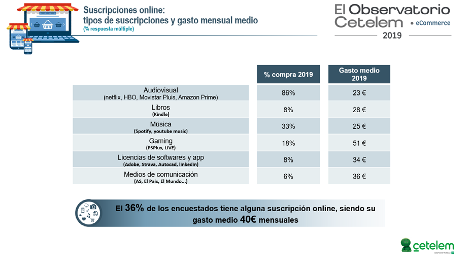 El estudio presentado hoy “Smart Consumer. El consumidor español conecta con la compra inteligente”, también señala que un 36% de los españoles encuestados tiene algún tipo de suscripción online, siendo el gasto medio de 40€.