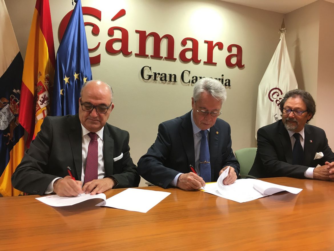 El presidente de la Cámara de Comercio de Gran Canaria, José Sánchez Tinoco, y el presidente de la Cámara Franco-Española de Comercio e Industria, La Chambre, Domingo San Felipe Cristóbal, firmaron hoy miércoles, 29 de marzo, un convenio de colaboración para fomentar las relaciones comerciales entre los empresarios de ambas regiones.